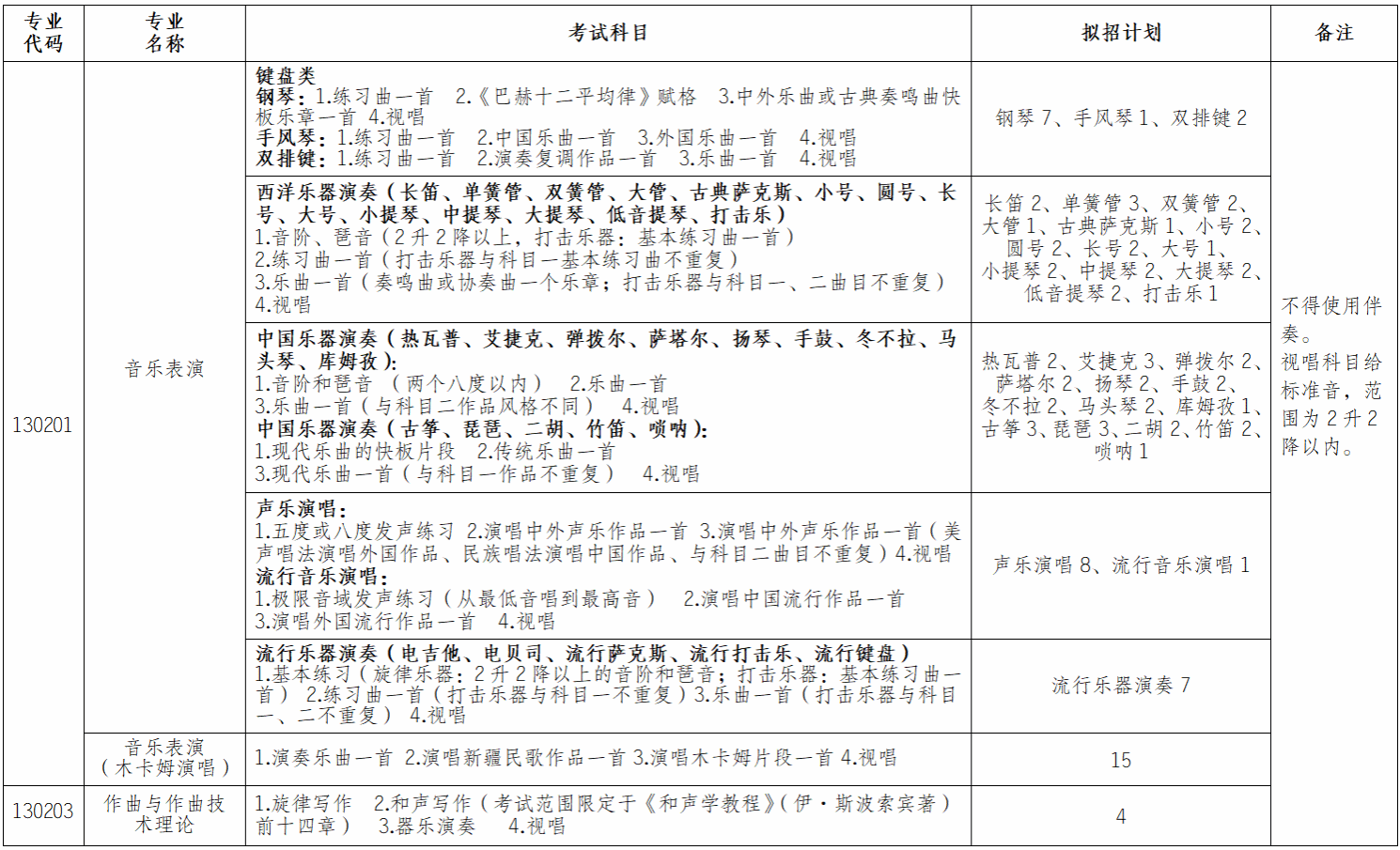 1.以上校考专业培养学院为音乐学院,学制4年,面向全国招生,不编制分省计划,最终招生计划以上级主管部门批复为准。